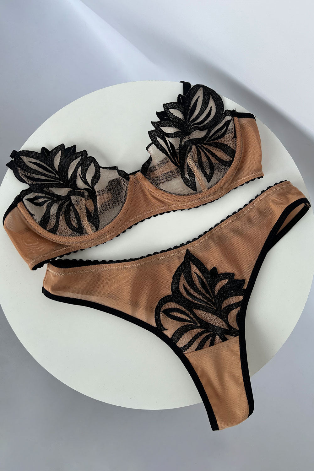 Тілесна стрейчева сітка створює ефект "другої шкіри", тоді як графічне чорне мереживо формує чіткий візуальний ритм і додає контрастного акценту.
