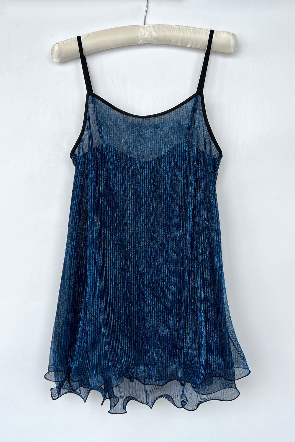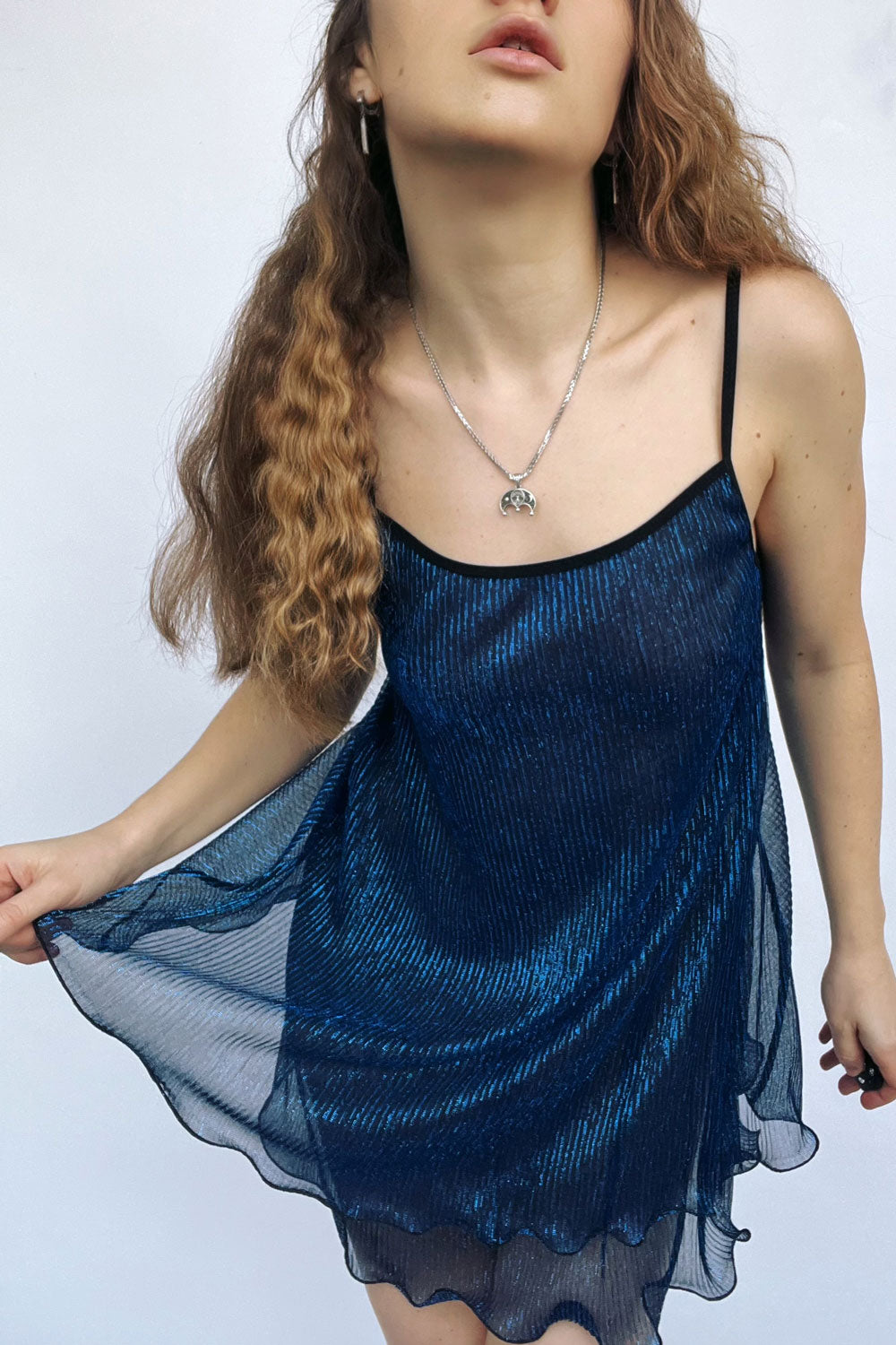 Внутрішній шар м’яко прилягає до тіла, забезпечуючи приємні відчуття, тоді як напівпрозорий верхній шар з приємної люрексової сіточки додає руху, світлової гри та делікатного блиску. Матеріал красиво драпується, реагує на кожен крок і створює ефект невагомості.